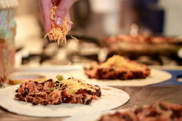 Coloque seis tortillas y rellenar con la mezcla uniformemente. Esparcir el queso más en la parte superior si lo desea.