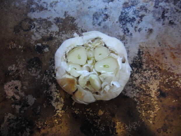 Mantener el bulbo de ajo en una sola pieza y cortar la parte superior del bulbo entero. Rociar aceite de oliva y asar en el horno a 350 grados durante 20 minutos.