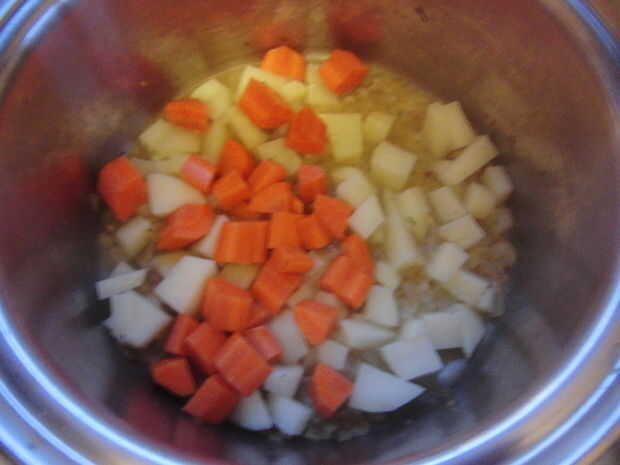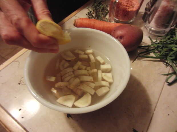 En este punto mientras que es asar el ajo tienes que picar la cebolla, la zanahoria y la patata. Les saltear en el aceite de oliva. También crear una solución de jugo de limón y agua. Pelar y picar el salsifí y ponerla en la solución para que no dar vuelta a marrón. Enjuagar las lentejas para que cuando usted deje correr agua a través de ellos sale claro.