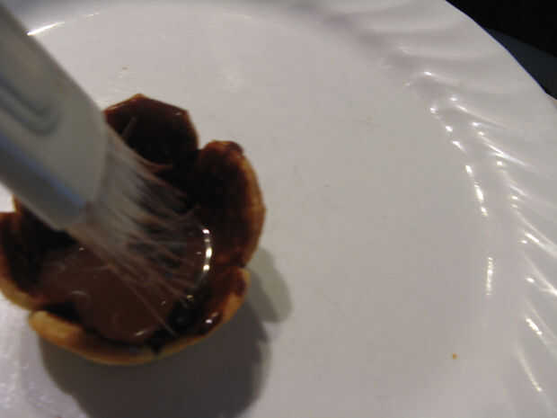 Una vez que las conchas de la empanada de Cutie se han enfriado completamente, use brocha de cocina para "pintar" dentro de las cortezas de pastel con relleno de cáscara de chocolate.  Situado en el congelador durante 10 minutos.