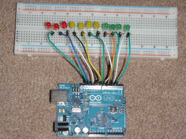 Ahora, vamos a lo positivo de los LEDs del alambre a los pines digitales de arduino.  Para ello tomar un puente de alambre y poner en el pin sobre el ladoizquierdodel primer LED verde y conecte el otro extremo al pin digital 3.  Haremos lo mismo para el segundo LED verde en el pin digital 4 y así sucesivamente y así sucesivamente.