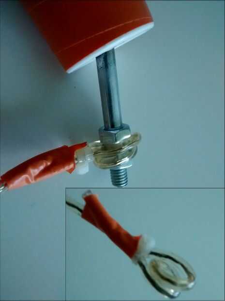 Sólo Inserte una tuerca y fuerza ajustada al principio de la rosca, lazo del tendedero dos veces sobre el tornillo y fijar con dos abrazaderas de plástico. Corta el cable extra y la cubierta con cinta adhesiva (tubo del encogimiento sea mejor). Entonces la segunda tuerca del hilo de rosca y gire lo mas ajustado posible (no te preocupes, no dañe el cable).