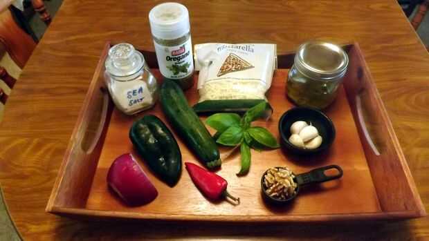 Salteado de calabacín, pimientos poblanos y cebollas rojas (1 / 4 paso)