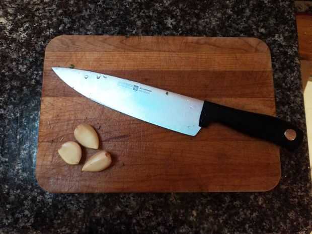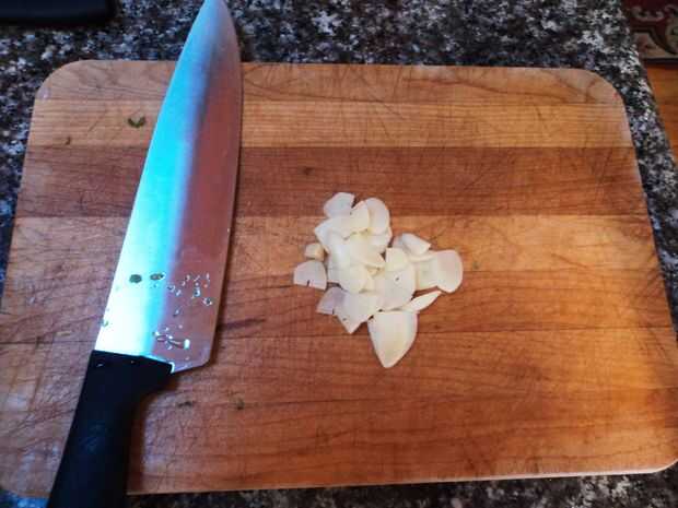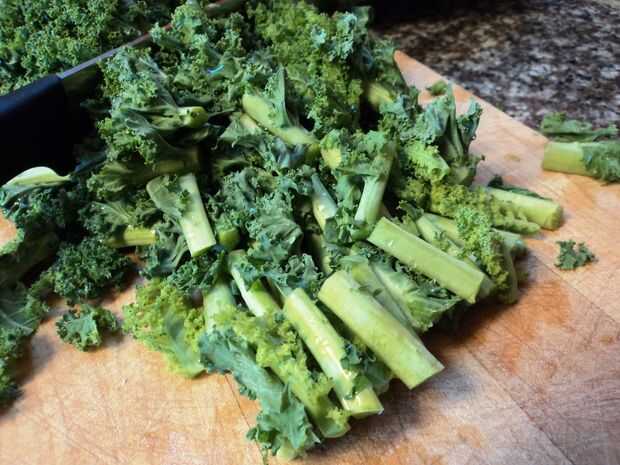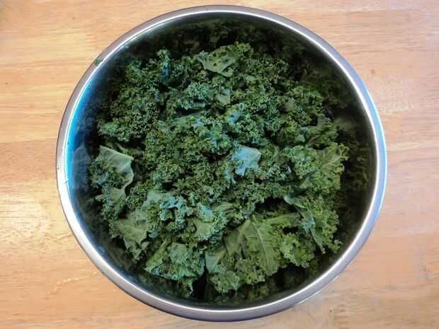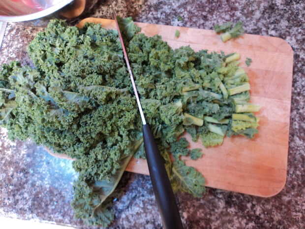 Mientras que las setas están empapando, picar col y ajo. Corte los tallos de la col rizada y a través de ellos en el compost. Poner el resto de la col rizada en un cuenco y reservar. Picar el ajo en finas astillas y apartar.