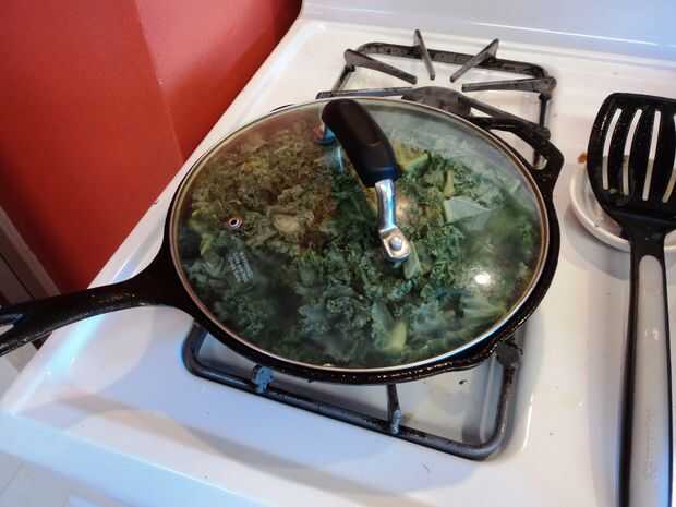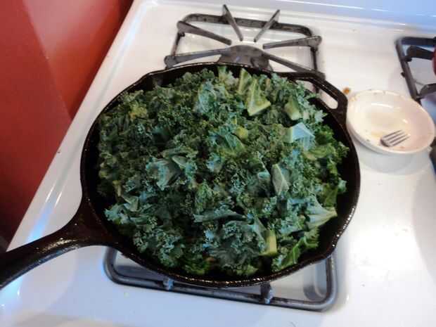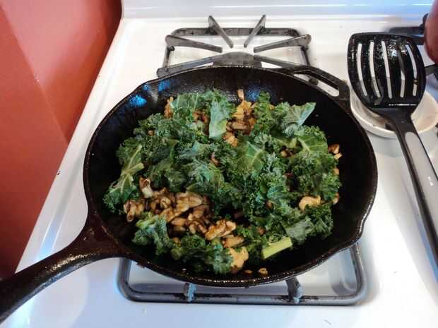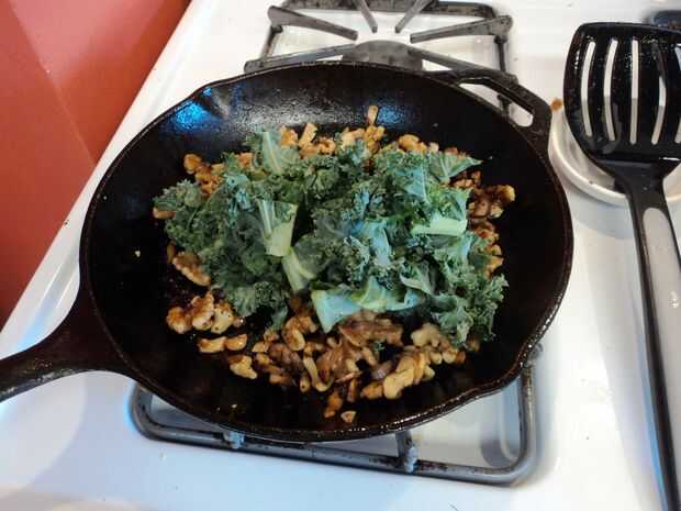 Añadir la col rizada al ajo y las nueces, asegurándose de que combinar las nueces y el ajo a lo largo de la col rizada.  Ponga una cubierta en la col y cocine a fuego medio durante 10-15 minutos.