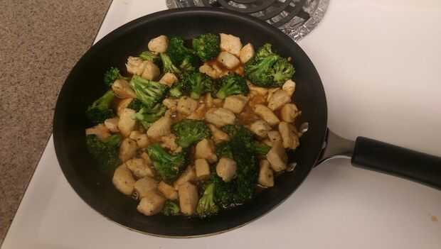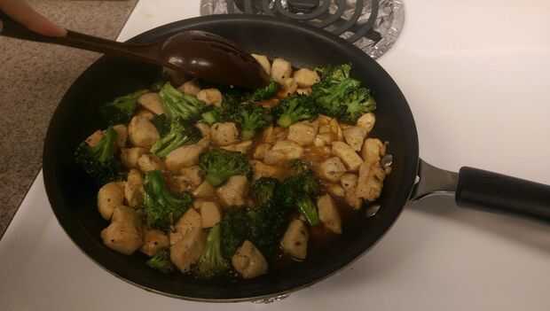 3) deje que la salsa se oscurezca y empezar a burbujear antes de echar todos los ingredientes juntos, asegurándose de que el pollo y brócoli son completamente cubiertos en la salsa.