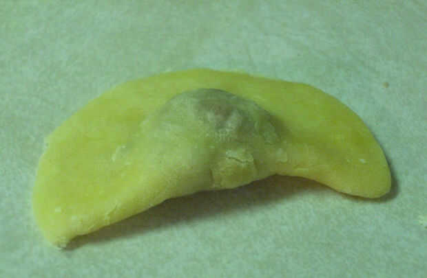 - Moje la ronda con mezcla de aceite + agua por lo que será más fácil sellar. Doblar la masa hacia usted hasta casi cumplir los dos bordes. Presione con firmeza el borde redondeado para sellar el relleno.