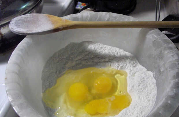 - Mezclar el aceite y huevos bien y vierta en el centro del pozo, luego mezclar pedacitos por pedacitos los ingredientes todo en el recipiente hasta que la mezcla realizar crumbles, utilizando espátula o cuchara de madera