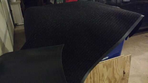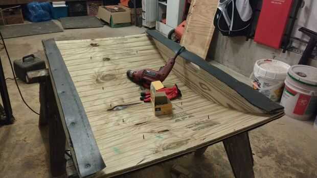 Comencé por una esquina a la esquina de la rampa de alineación, había atornillado abajo y luego ajustaron hasta que perfectamente cubre el radio de la rampa. He dejado una poco saliente. Una vez que la primera cara estaba enroscada, me mudé a la otra y entonces acabado con tachuelas los extremos cortos y poniendo juegos de tornillos hasta la mitad para evitar que la estera de deslizamiento en la superficie de madera contrachapada.