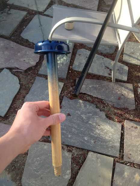 Desarmar canasta coladora de cocina fregadero así que puede ser atornillado en madera espiga e insertado en el extremo superior del poste de la piscina.