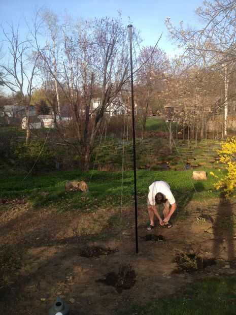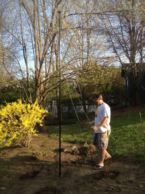 Atar la cuerda a las estacas del poste de 3 pies lejos de base de poste y enfrente uno del otro para apoyar todo el camino alrededor.