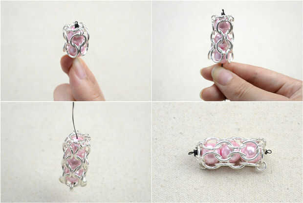 6, hacen un total de 3 filas de anillas entrelazadas, con otro 2 perlas en la jaula;
