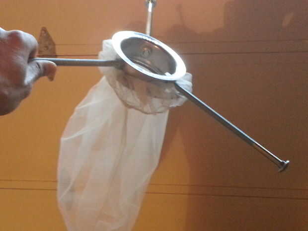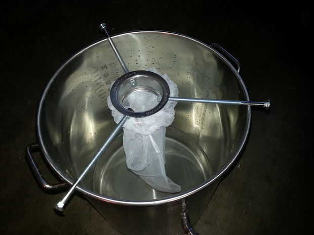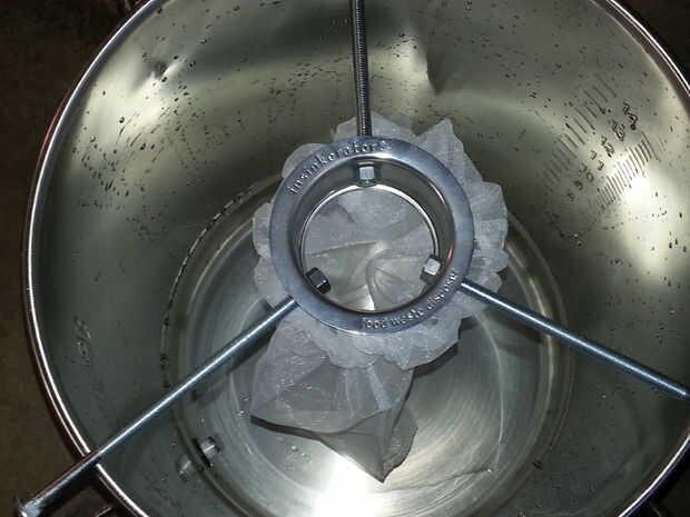 4. Deslice la abrazadera de la manguera en el desagüe y se usa para sostener la bolsa de filtro de pintura. Apriete un poco para que la bolsa no cae en la hierba. Una buena longitud de la bolsa de filtro es por lo que se queda un poco fuera de la parte inferior de su Hervidora de agua
