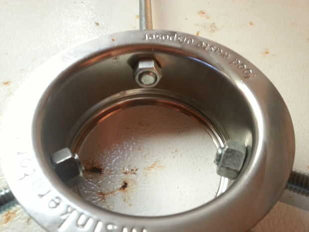 3. Coloque una tuerca en cada perno de carruaje y luego deslícelo a través de los orificios que ha perforado. poner otra tuerca en el interior del desagüe y bloquear el tornillo de carro allí.