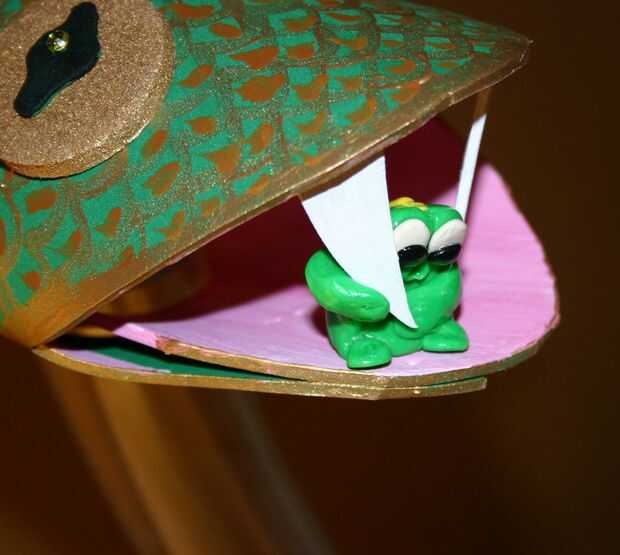 Poner la cobarde saltaba rana en la boca, colgando de uno de los colmillos.
