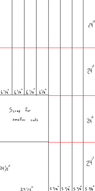 Después al hilo de las tablas de cortar en segmentos de 24". Mantener el conjunto que venía de cada tablón juntos por lo que no necesitará preocuparse por ligeras diferencias en el ancho entre las tablas cuando enmarcando las bandejas.