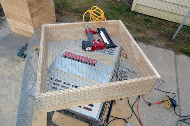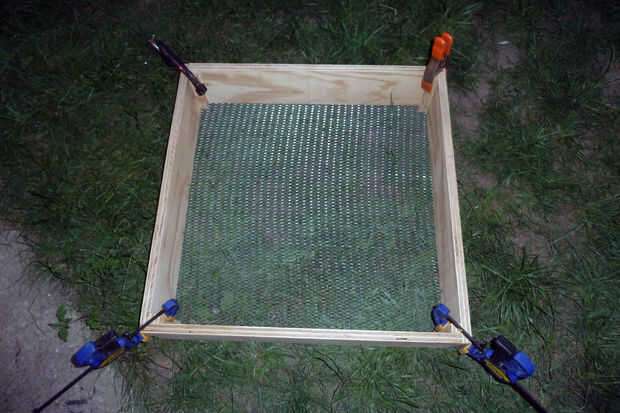 Esta cosa no tiene que soportar un huracán pero queremos razonablemente robusto. Para las esquinas sólo rasgar tiras unas unos 3/4" de ancho de la pieza de chatarra y picar hasta ~ 5. Utilice pegamento para madera para fijar en las esquinas con unas pinzas para sostenerlos mientras se secan.