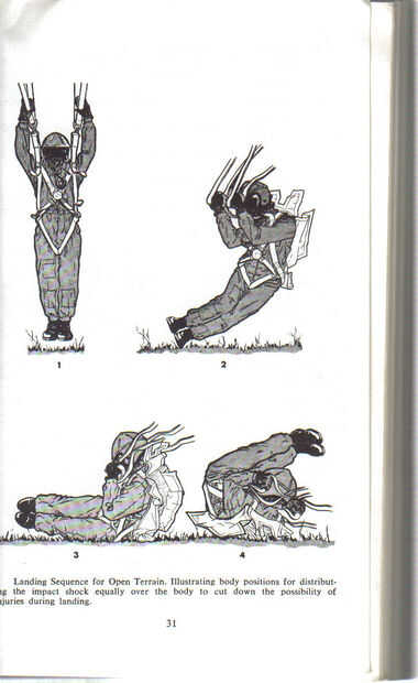 B. Bush. Al aterrizar en zonas boscosas, realizar el mismo procedimiento con la excepción de debes proteger tu rostro con los brazos y tener más curva en las rodillas. Sobre todo mantener los pies y las piernas juntos!