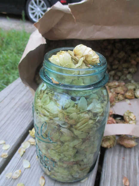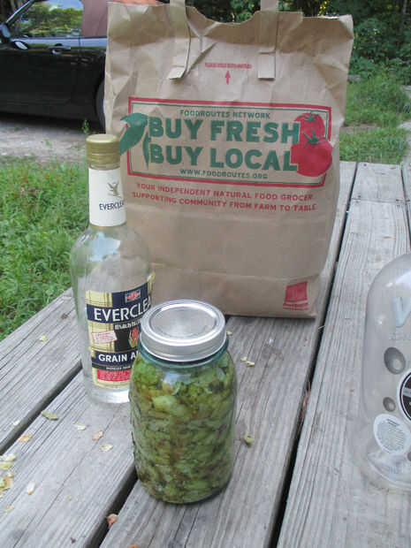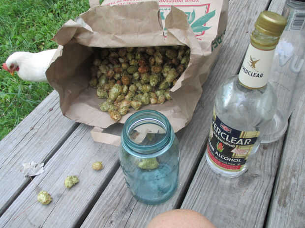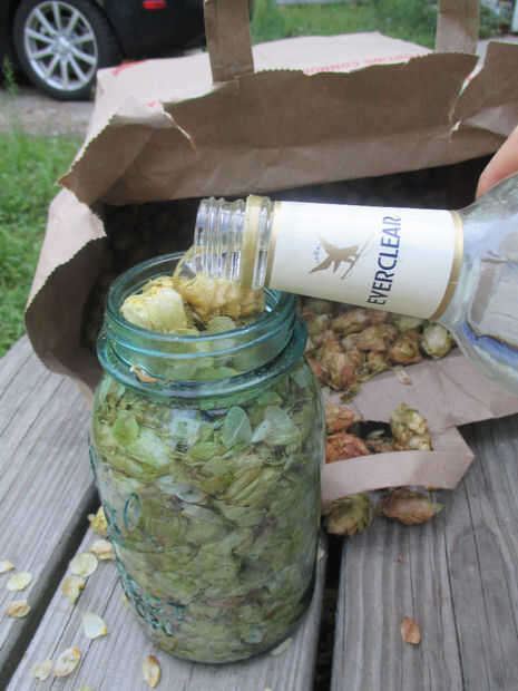 Según sobre el proceso, rellena un tarro de cristal del cuarto de galón con conos de lúpulo hermoso, aromático, seco, luego vierte el Everclear, llena a aproximadamente una pulgada por debajo de la parte superior. He pulsado el lúpulo en la parte superior hacia abajo en el líquido con una pequeña cuchara de madera. Que cerrar y guardar durante una semana. ¿Por qué sólo una semana y no seis? ¿Están bromeando? Esto es demasiado emocionante esperar! Además, creo que el olor se impartirá inmediatamente y esperar 6 semanas con la posibilidad de ninguna diferencia notable en la intensidad de aroma suena aburrido.