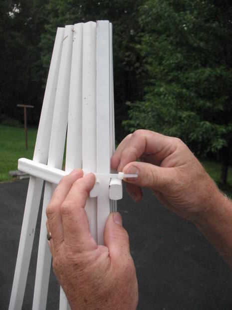 Con los extremos amplia de enrejados hacia abajo, sostenga los extremos estrechos de vertical 2 enrejados y unirse a ellos firmemente junto con un lazo de alambre donde se encuentran, procurando que la atadura quede sobre la horizontal de piezas, no por debajo (ver foto).