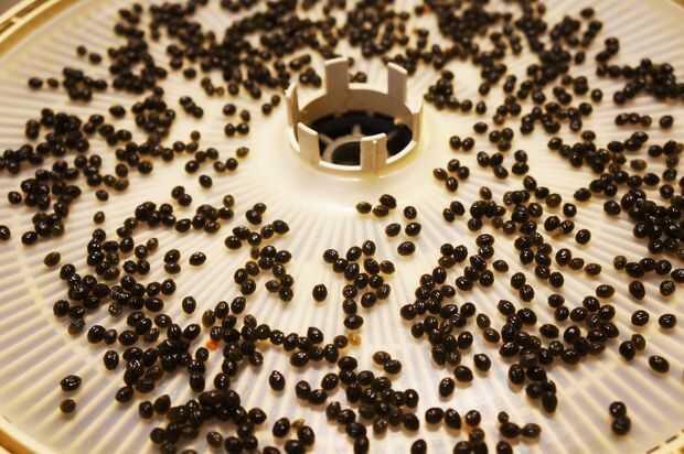 Coloque las semillas de papaya seca en los alimentos de la secadora y seca durante varias horas o hasta que las semillas estén completamente secas.