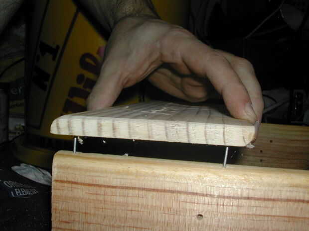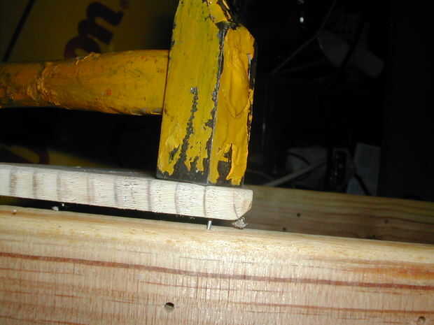 2) golpe en mitad de camino de los clavos en la primera pieza de madera. Tienes que golpear en el "otro punto" de la uña, ya que ofrece más resistencia que el punto real.