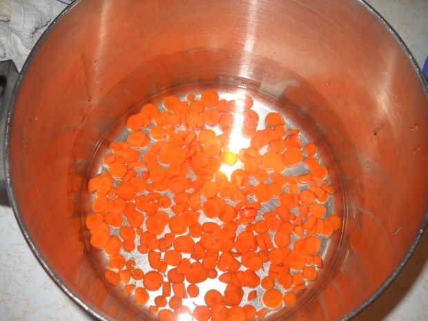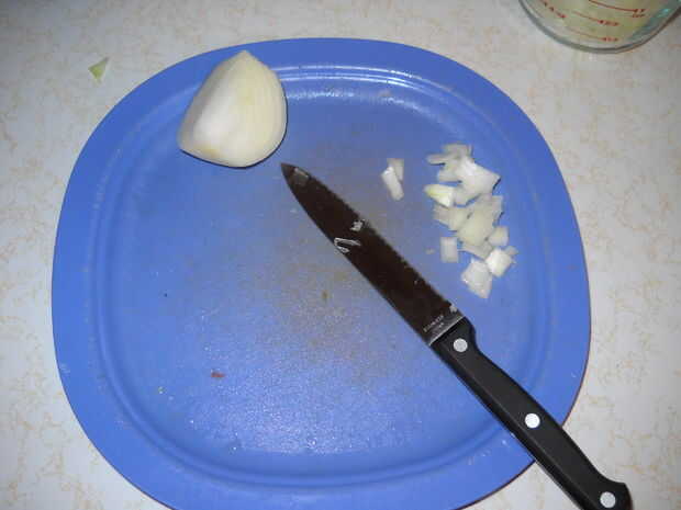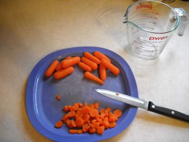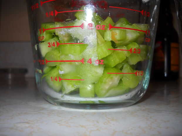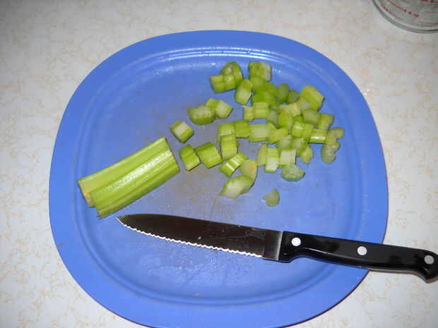 En primer lugar, cortar la cebolla.  Mi método preferido es cortado en cuartos y cortar a partir de ahí. Asegúrese de que tener al menos una taza de cebolla de choppd.  Más está bien, pero no es menos.  A continuación, cortar los tallos de apio hasta que tenga una taza.  Vierta la cebolla y el apio en una sartén.  Luego, cortar zanahorias hasta que quede una taza.  Vierta en una olla grande con cuatro tazas de agua.