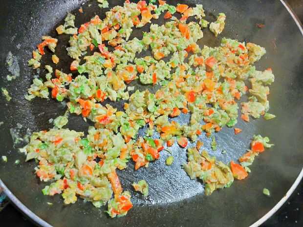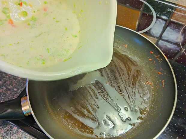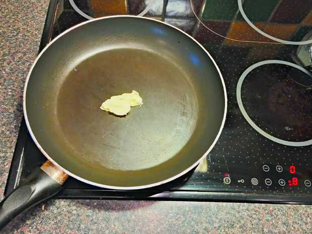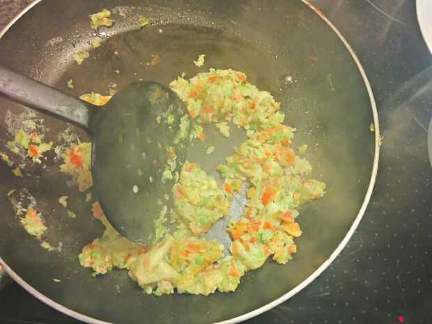 Poner mantequilla en la sartén para que no se pegue. Ponga la estufa el casi máximo, 8 de 9 en la mía. Cuando ha frito, puré con la herramienta de flipper, por lo que descompone. Poner en un plato y listo.