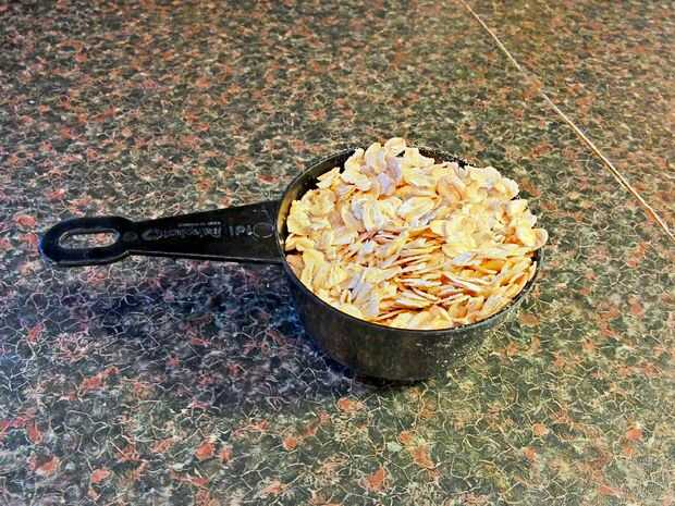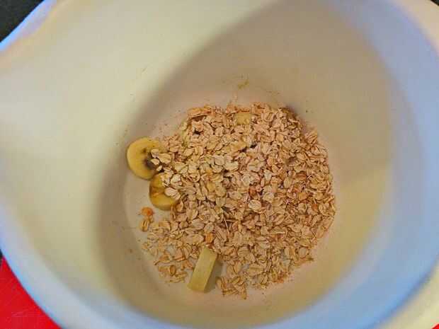 Añadir 1 dl, 0,4 tazas de avena en el recipiente.