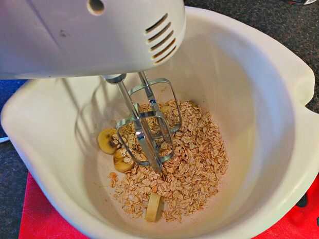 Cuando se mezcla con batidora eléctrica, pisotear con la batidora los plátanos como son difíciles de triturar. El resultado debería verse como la tercera imagen.
