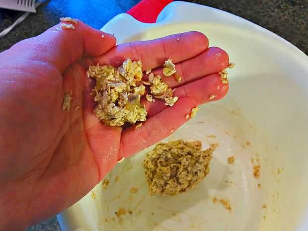 Recoger la consistencia y el pack a una pelota grande. Recoger algunos de la consistencia y forma una bolita. No puede formarlas con Hans ahuecados como son muy pegajosa, pegajosa. Recomiendo tirar ligeramente en cada mano y formas una bola.