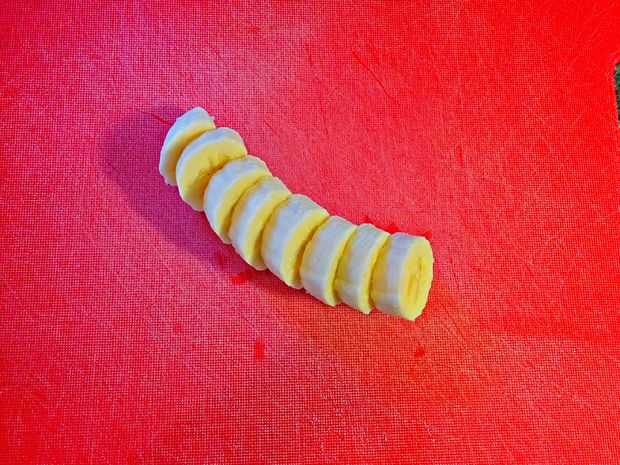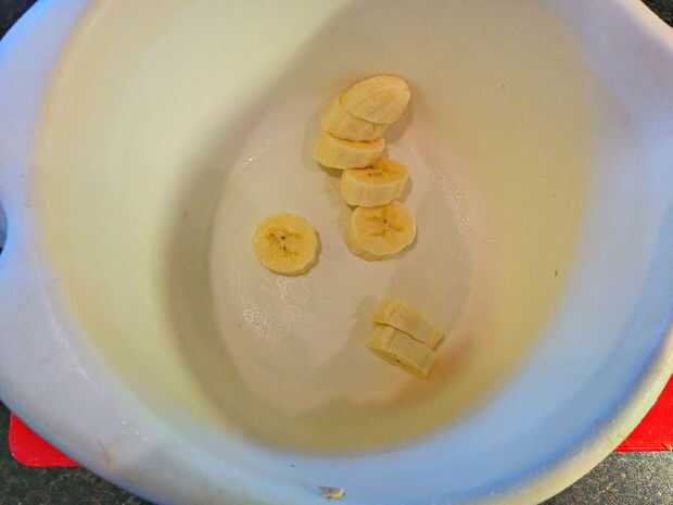 Usar la otra mitad del plátano, cortado en rodajas para machacar más fácil y poner en el tazón de fuente.