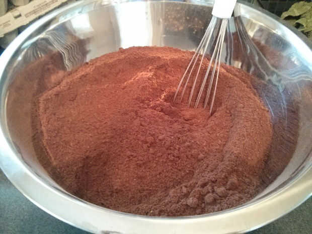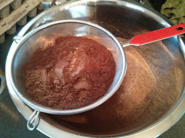 Poner las 2 tazas de cacao a través del tamiz siguiente. Luego se mezclan los dos ingredientes juntos. Apartar este tazón de fuente después de que se mezclan.