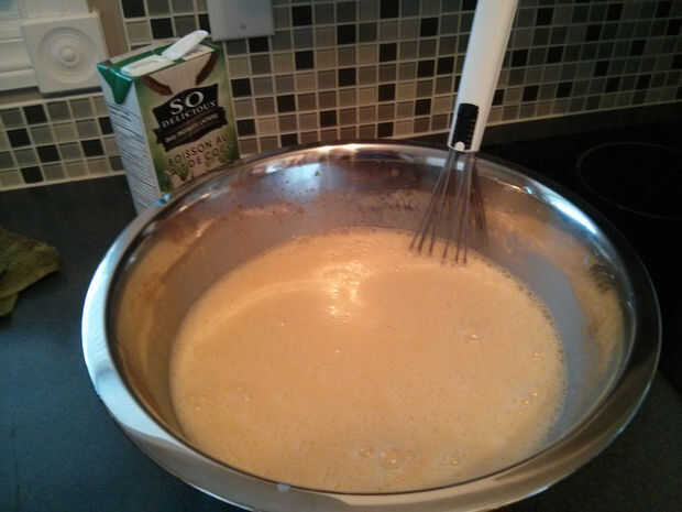 Ahora salga su tazón de fuente aún mayor y crack 36 todos sus huevos en él. Luego Vierta el litro de leche. Por último, coge tu bate y bata los huevos y la leche.