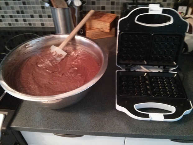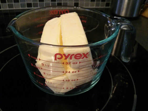 Ahora poner la mantequilla en el microondas y caliente hasta que apenas se licueface. Esto verter en el bol con los ingredientes y mezclar. Al principio aparece la mantequilla sólo flotan en la superficie, pero mantener la mezcla y a trabajar juntos muy bien. Por alguna razón la mantequilla hace que la mezcla aún más difícil para revolver, por lo que esperan su hombro para llegar muy cansados. Es una buena idea para empezar a calentar la waflera casi al mismo tiempo que comenzar a mezclar.