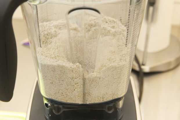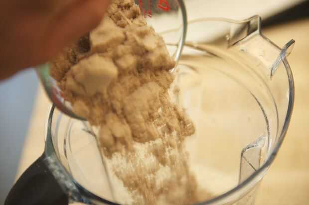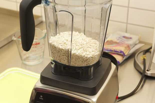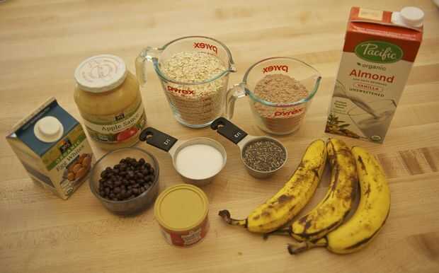 Moler la avena en la licuadora hasta que queden casi como harina. Descarga en el resto de los ingredientes secos y mezclar hasta que todo se mezcla. Añadir los ingredientes húmedos y 3 bananas, mezcle por un minuto o dos hasta combinar bien. Trocear el plátano restante y agregue a la licuadora con una cuchara. No encender la batidora para este paso, porque va a destruir tus trozos de plátano poco!