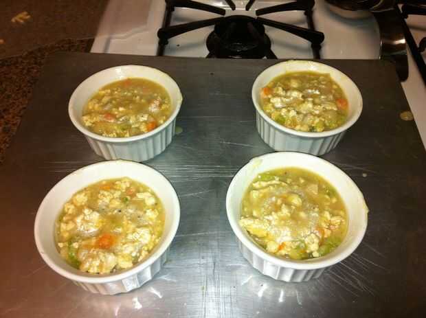 Con un cucharón, cuchara cantidades iguales de la mezcla de verduras y sopa de pollo en cada molde.
