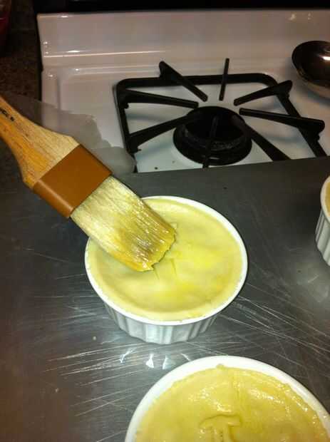 Lugar una tarta redonda sobre cada molde y cepillo de lavado de huevo sobre la parte superior.