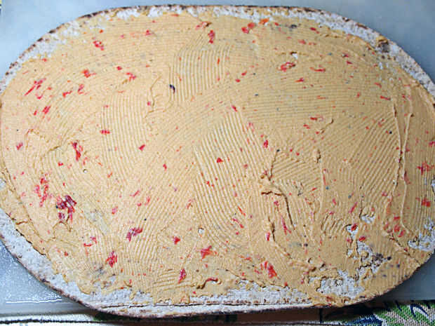 Luego, se extendió el hummus en el abrigo.