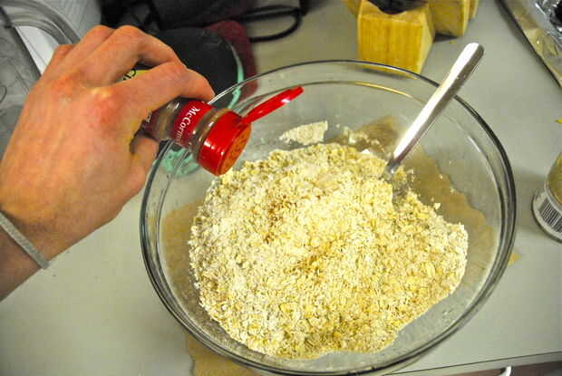 En una licuadora, procesadora o molinillo de café, hacer 2 tazas de harina de avena moliendo 2 tazas ya sea en avena o avena de cocción rápida. En un tazón grande, mezcle la avena y otros ingredientes secos y mezclar pulg agregar la compota de manzana y claras de huevo y mezclar a mano o con las aspas hasta que la mezcla se combina bien. Para llegar a la consistencia deseada, agregar la leche de almendras.