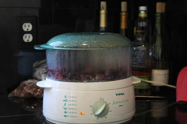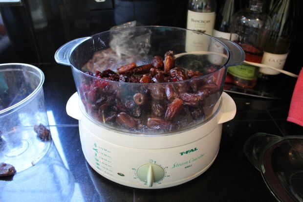 Colocar fechas, arándanos y cerezas en una vaporera.