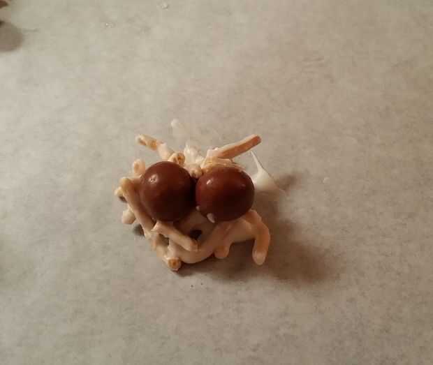 Una vez se han endurecido por los derretimientos de caramelo examinar su montículo por uno posible. Tienes que encontrar unos fideos largos de sobresalga hacia la parte superior del montículo sobre el que colocar estos. Si no ve cualquier probable ubicación, saque unos tallarines de la taza de fideos de caramelo-revestida y lugar para uno. (Si es necesario, el recipiente puede microwaved para ráfagas de 30 segundos, removiendo entre explosiones.) Si lo desea, puede añadir unos fideos más alrededor o junto a las bolas de leche malteada en este momento.