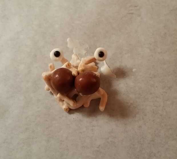 Agregar una pequeña gota de caramelo blanco fundido al final de cada pedúnculo y poner un ojo en cada uno.