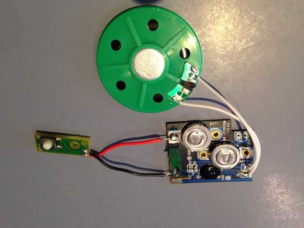 El circuito es muy básico, que presionar el contacto de metal, que completa el circuito, que hace que la música jugar. Dos baterías de botón están alimentando el circuito - no tengo idea cuánto tiempo las pilas se suponen a pasado. Dado que una tarjeta de cumpleaños es por definición sólo por un día, entonces no mantengo muchas esperanzas!