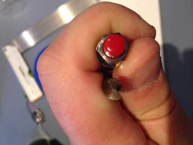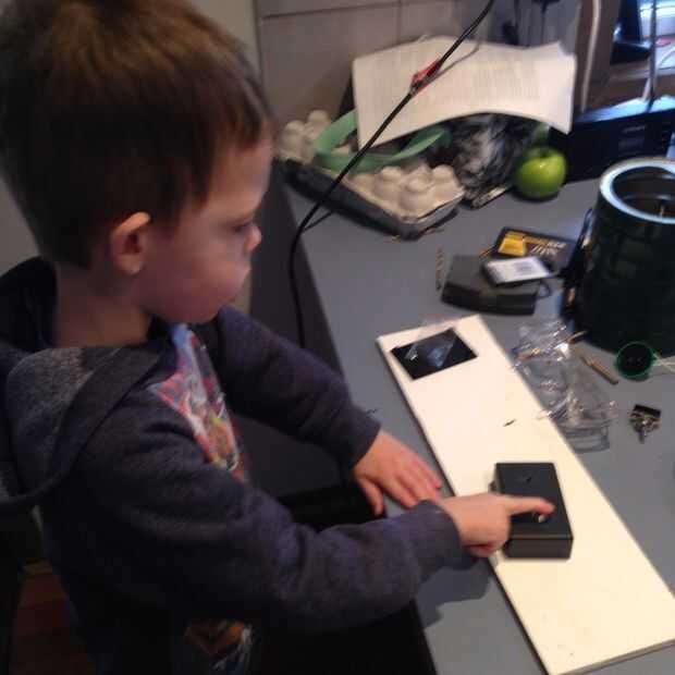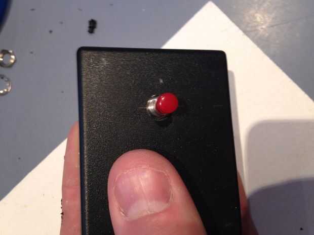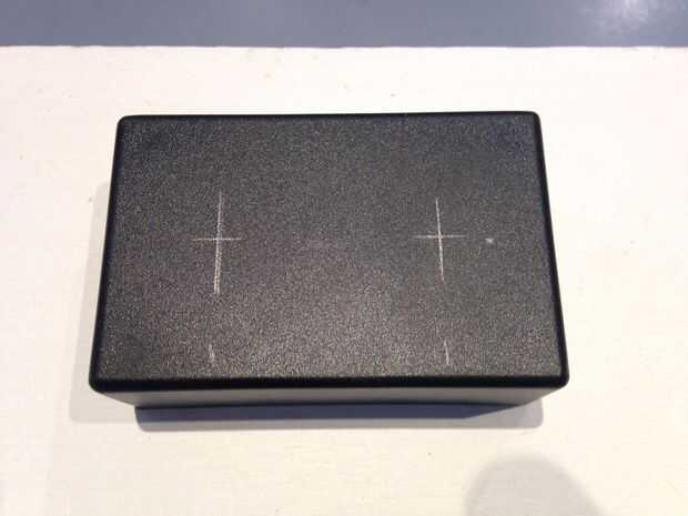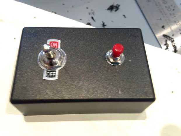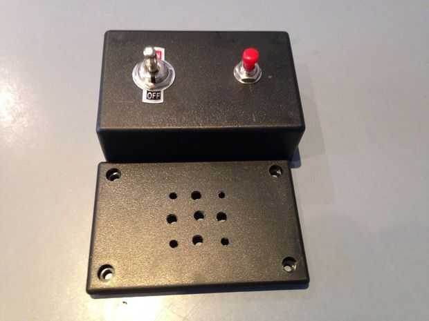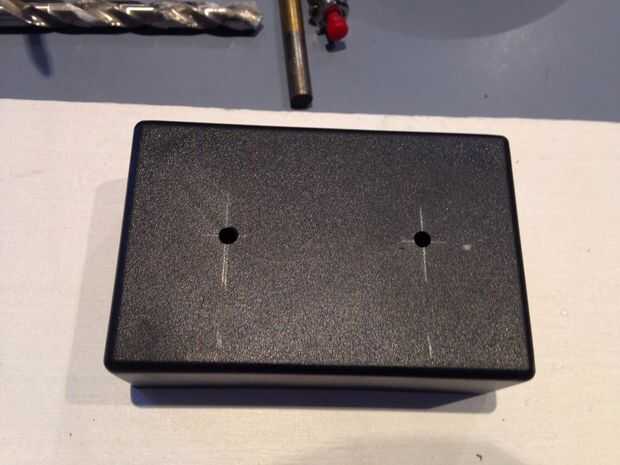 Para alojar los interruptores debe perforar algunos agujeros para que pop a través de. Me fui de lado a lado en el centro. Usted debe tener cuidado para asegurarse de que el cuerpo del botón no estar obstaculizado y que hay suficiente tamaño para el circuito de audio en la casilla. Utilicé una caja pequeña y cabe casi todo allí.
