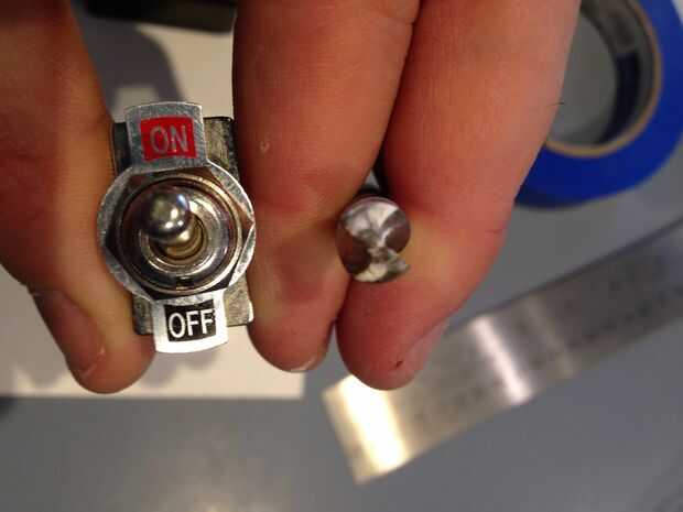 Prueba y tamaño de la broca para cada interruptor. No estaba muy organizado aquí con mi esfuerzo en eso no prestar atención al tamaño real del interruptor, así que trató de tamaño hacia arriba, ver las fotos. No tengo una gran variedad de tamaños de taladro por lo que tenía que ser creativo para el interruptor de palanca debido a su diámetro de 12 mm. Cuando la perforación estaba girando el taladro para crear un agujero de diámetro más grande - llegamos al final.