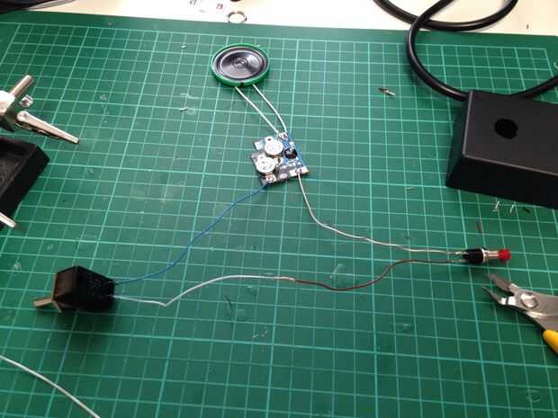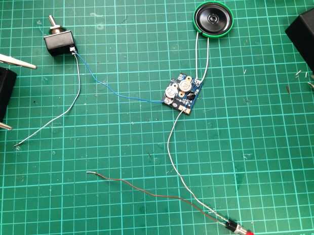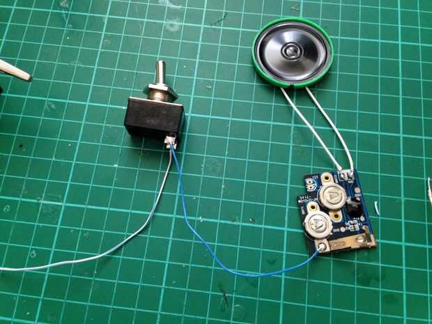 El siguiente paso es crear el cableado del interruptor y coloque esto en el circuito. Los interruptores será lo que Riley utilizará para reproducir el audio de la caja. Los interruptores serán conectados en serie, lo que significa que el interruptor tendrá que estar en la posición On en orden para el interruptor momentáneo que activa. Este cableado se conecta entre los dos bornes donde se encontraba profusamente el interruptor temporal.