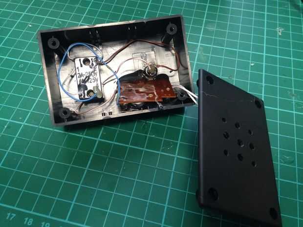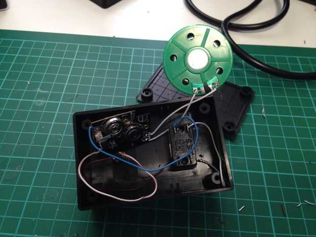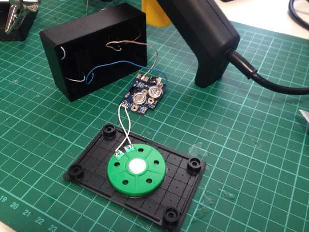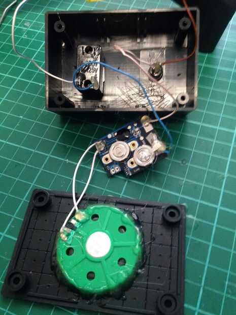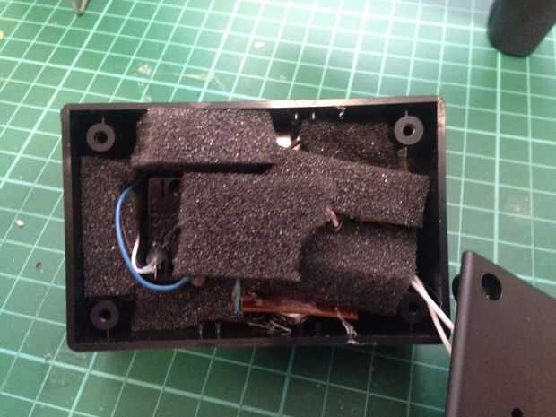 Yo no soy un audiófilo por cualquier tramo de la imaginación, pero me di cuenta de que el sonido por el altavoz era pesado y un poco débil. Para tratar de suavizar el sonido añadí algunos trozos de espuma en la caja antes de cierre para arriba. La teoría era amortiguar el sonido para hacer que suene menos duro. También, fuera del embalaje con espuma wil proporcionar cierta amortiguación si Riley cae la caja.