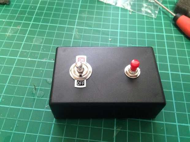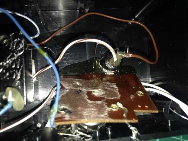 La placa de circuito debían colocarse en la caja en ángulo debido a la mayor parte del cuerpo del interruptor. Me tuvo suerte y fue capaz de encajar un ángulo. Quería fijar en su lugar tanto como sea posible así que marqué el interior de la caja donde la Junta haría contacto, esto para que la cola tenía una superficie áspera se adhieran a. Luego colocar el tablero en y cayó una gota grande de pegamento, asegurándose de que el pegamento fue en la parte inferior de la Junta y en contacto con la caja.