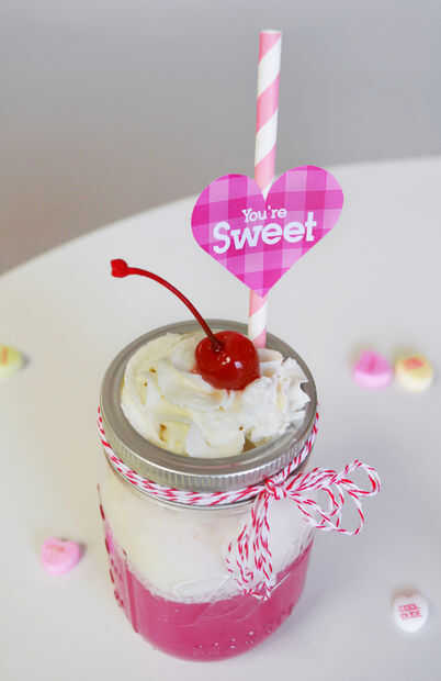 Soda se dividen en dos tarros de masón de grande. Añadir 1/2 taza de helado a cada uno. Parte superior con crema batida y una cereza si lo desea, añaden su paja de San Valentín.